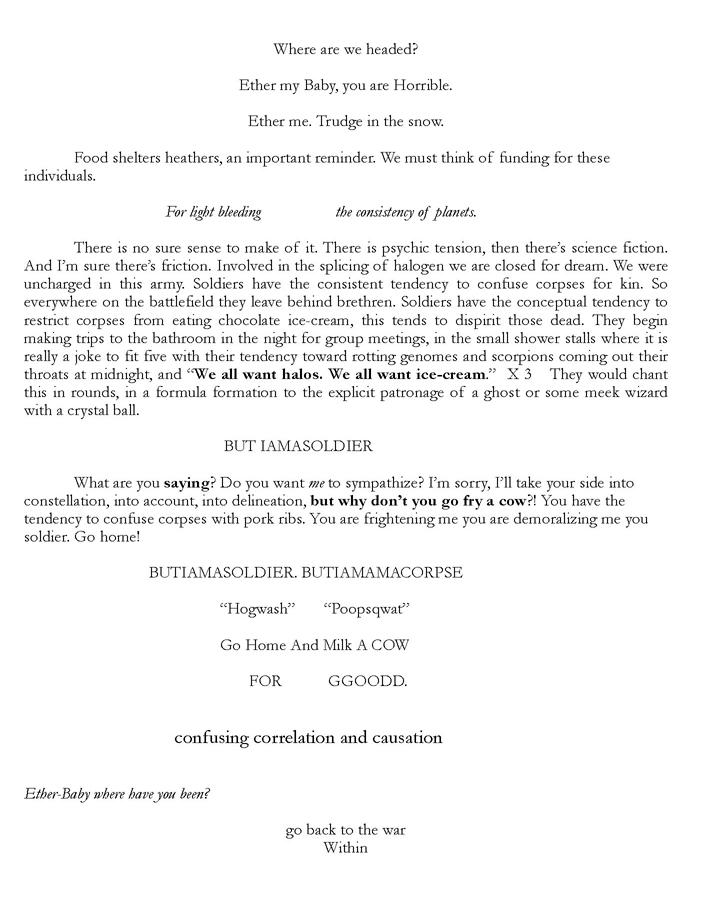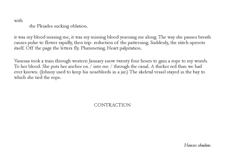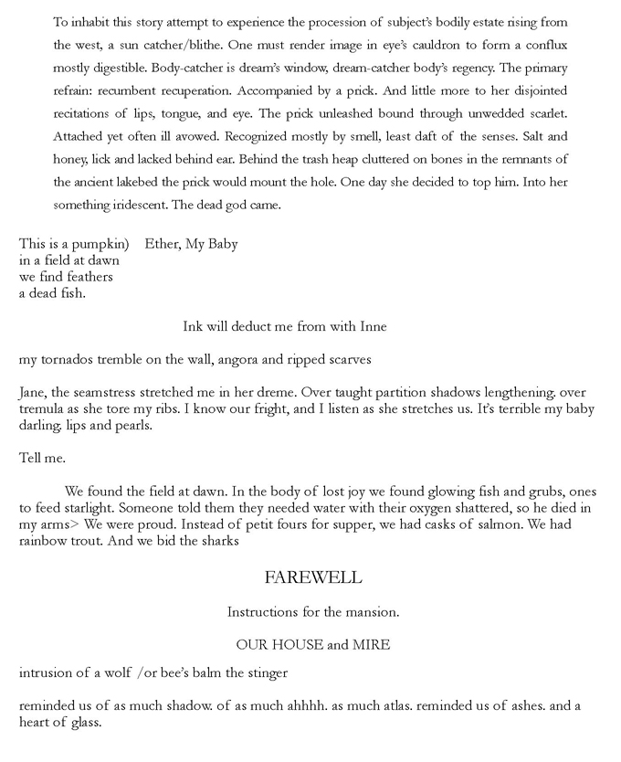 Thirty years ago millions of kitty embryos coalesced on a full moon, thus SHERRI MARILENA PAULI was born unto the world, pen in hand, sailing on the back of a wild horse, moved to do the bidding of the darkest piece of earth. A frequent collaborator with visual artist Jenni Lord, Sherri is almost finished with writing at Naropa University, and plans next to investigate the breath of five quondam generations through ink and movement. She also has translations in Bombay Gin this Summer. Word!